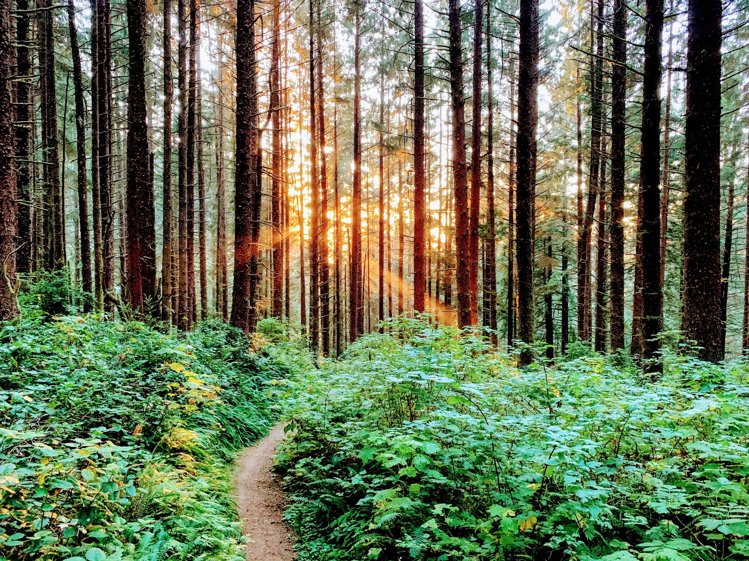 Sunlight on redwood trees in Crescent City, CA
